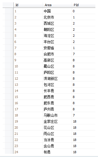 --通过子节点查询父节点 WITH TREE AS( SELECT * FROM Areas WHERE id = 6 -- 要查询的子 id UNION ALL SELECT Areas.* FROM Areas, TREE WHERE TREE.PId = Areas.Id ) SELECT Area FROM TREE --通过父节点查询子节点 WITH TREE AS( SELECT * FROM Areas WHERE id = 7 -- 要查询的子 id UNION ALL SELECT Areas.* FROM Areas, TREE WHERE TREE.Id = Areas.PId ) SELECT Area FROM TREE