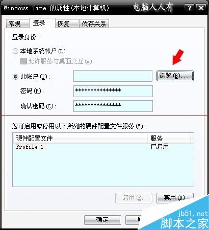 5、Windows Time服务属性→登录→此账户→将当前的账户涵盖进去。