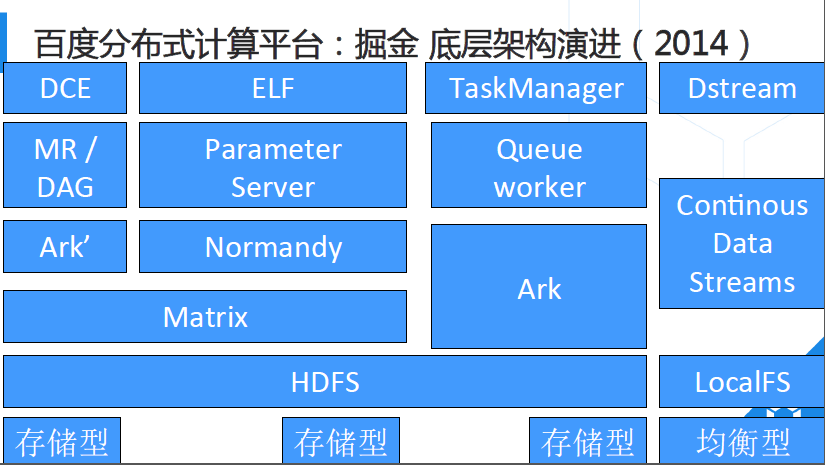 2012年系统架构中,最主要的两个离线计算平台,左边是以MapReduce模型为主的批量计算平台BMR,右边是MPI /BSP模型为主的大规模机器学习平台BML。从最下面可以看到,MapReduce和MPI模型底层硬件就有较大差异。Hadoop分布式文件系统多副本以及强大的故障处理机制,使得Raid卡完全没有必要,采用多块超大容量SATA硬盘非常适合。