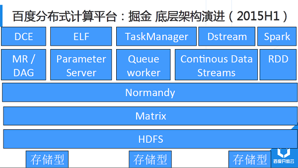 2015年的架构改进,主要是将所有的计算模型均迁移到Matrix+Normandy架构。Normandy兼容社区Yarn调度接口,开源社区新型兴计算平台可以很轻松的接入到百度的计算生态里。