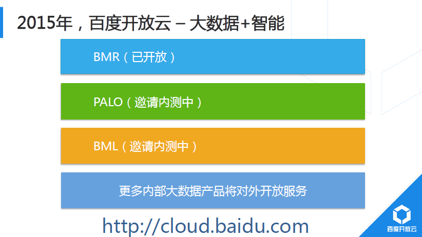 最后,向大家简要介绍百度开放云。2014年,百度正式决定将服务内部业务多年的云计算技术正式对外提供服务,即百度开放云,对应官网http://cloud.baidu.com。百度开放云大数据方面,BMR已经对外开放,而更多的大数据分析和服务都还未对外开放。BMR集群上可以做到按需部署,用户专享,更关键的是完全兼容开源的Hadoop/Spark平台,开放云客户基于Hadoop、Spark、Hbase等已经实现的大数据业务几乎不用修改就可以平滑迁移到云上。多维分析服务Palo,它完全兼容MySQL网络协议,因此,客户朋友们熟悉的Mysql Client的工具均可使用。