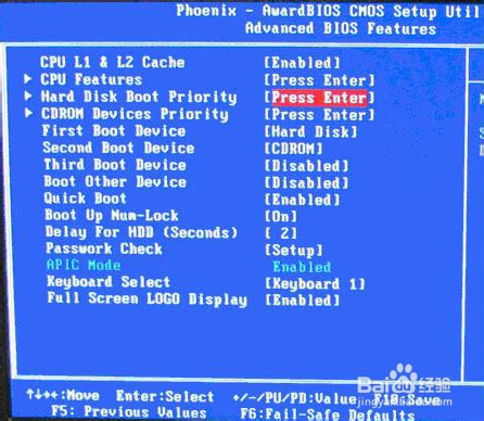高级BIOS设置(Advanced BIOS Features)界面,首先选择硬盘启动优先级:Hard Disk Boot Priority 如下图: