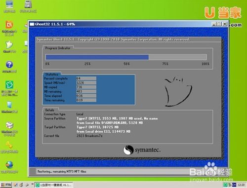点击确定后我们勾选“完成后重启”,点击“是”按钮进入GHOST安装介面,请耐心等待到恢复进度条全部完全后即可,如下图所示