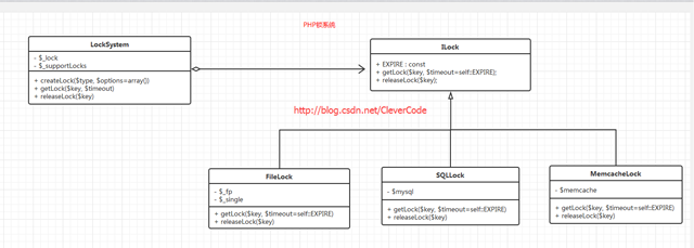 锁的操作一般只有两步,一 获取锁(getLock);二是释放锁(releaseLock)。但现实锁的方式有很多种,可以是文件方式实现;sql实现;Memcache实现;根据这种场景我们考虑使用策略模式。