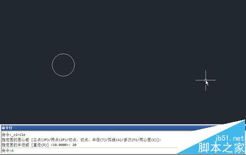 输入C,回车,调用画圆的命令,在图中单击确定圆的圆心,输入20,回车,画一个半径20的圆,如下图所示。