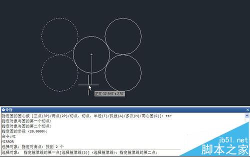 4、输入MI,回车,执行镜像命令,框选竖向排列的两个圆,回车,捕捉中间圆的圆心,保证正交打开的状态下,向下拖动光标,镜像生成右侧的两个圆,如下图所示。