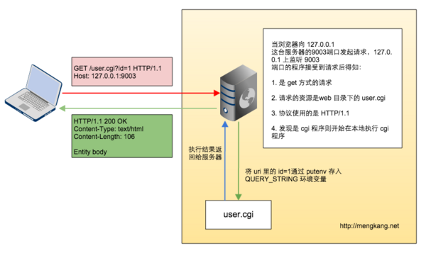 下面我们也以 CGI 的 QUERY_STRING 作为桥梁,将客户端请求的 uri 中的信息传递到 cgi 程序中去。通过 putenv 的方式把 QUERY_STRING 存入该请求的环境变量中。