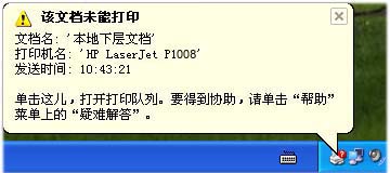发送打印任务后,激光打印机不执行打印任务,电脑屏幕提示“该文档未能打印,本地下层文档”。如图 1 错误提示所示: