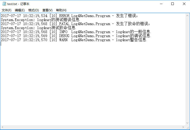 log.Fatal("发生了致命的错误:", new Exception("log4net测试致命信息"));