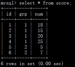 SELECT * FROM score AS t3 WHERE ( SELECT COUNT(*) FROM score AS t1 LEFT JOIN score AS t2 ON t1.grp = t2.grp AND t1.num < t2.num WHERE t1.id = t3.id ) < 3 ORDER BY t3.grp ASC, num DESC