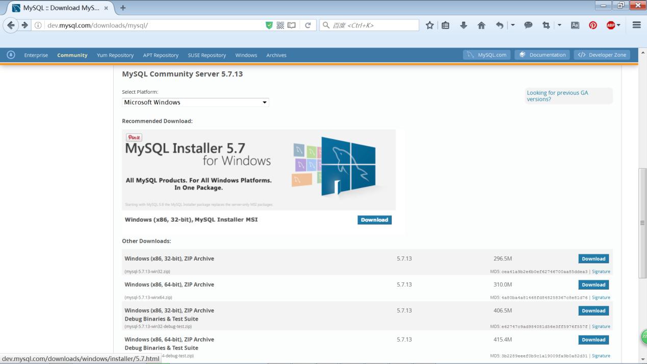 准备工作:MySQL zip格式安装包,mysql-5.7.13-win32.zip,下载地址http://dev.mysql.com/downloads/mysql/