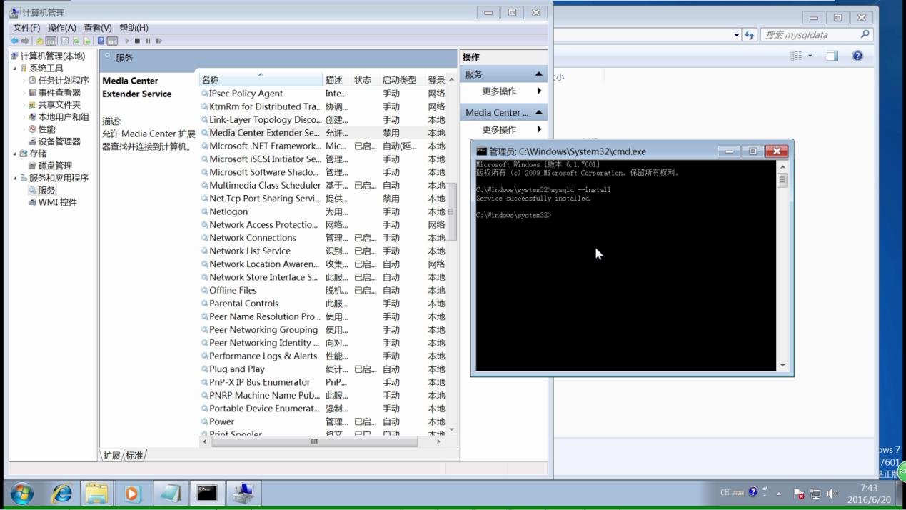 6以管理员身份运行cmd,输入mysqld --install 安装mysql服务。