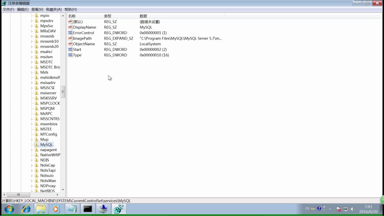 更改ImagePath 值为mysql\bin所在路径,例如本例中:"C:\mysql\bin\mysqld" MySQL