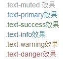 <div class="text-muted">.text-muted 效果</div> <div class="text-primary">.text-primary效果</div> <div class="text-success">.text-success效果</div> <div class="text-info">.text-info效果</div> <div class="text-warning">.text-warning效果</div> <div class="text-danger">.text-danger效果</div>