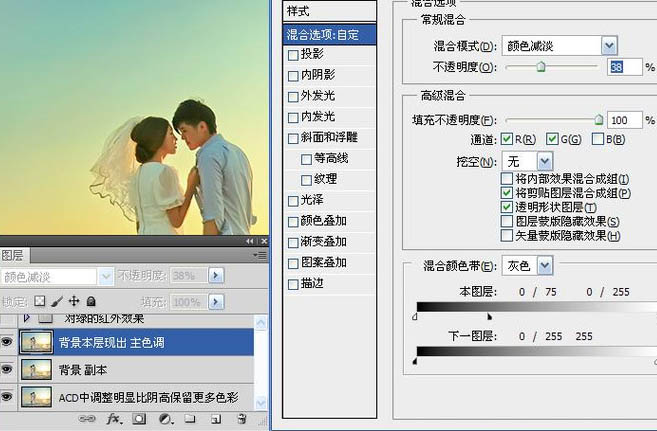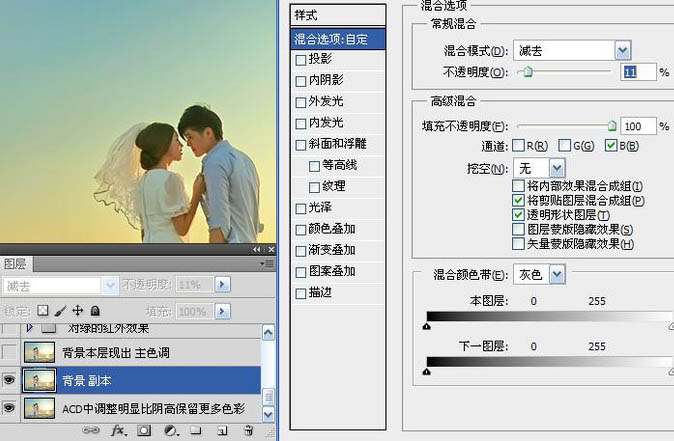 3、图层通道调色,去掉面板中某些通道前面的勾,结合混合模式及不透明度使PS调图空间豁然广大,上黄色,二层决定。