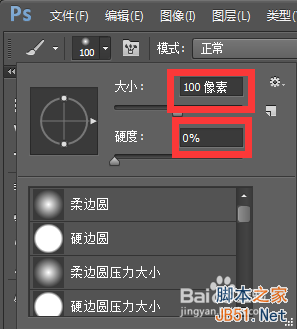 4、点击工具栏内【画笔工具】,将画笔大小调到硬度调为100像素,硬度改为0%。