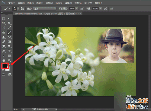 5、现在的前景色为黑色,我们使用画笔工具在带有小孩子头像的图片上进行涂抹,如图,黑色涂抹过后的部分消失了。
