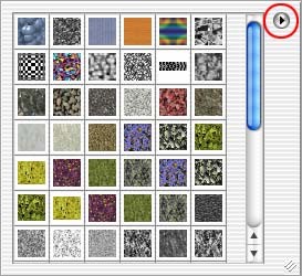 接下来,我们将应用 Photoshop 的一种图案效果,以便使我们的形状更有趣。在图层调板中选择一个新形状,然后选取“图层”>“更改图层内容”>“图案”。在“图案填充”对话框中,点按图案以打开“图案”调板。点按黑色三角形打开“调板”菜单。