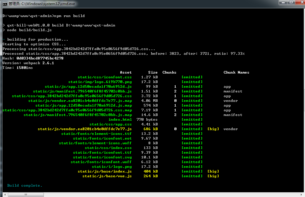 //上面文件改好后,开始打包,执行如下命令: npm run build