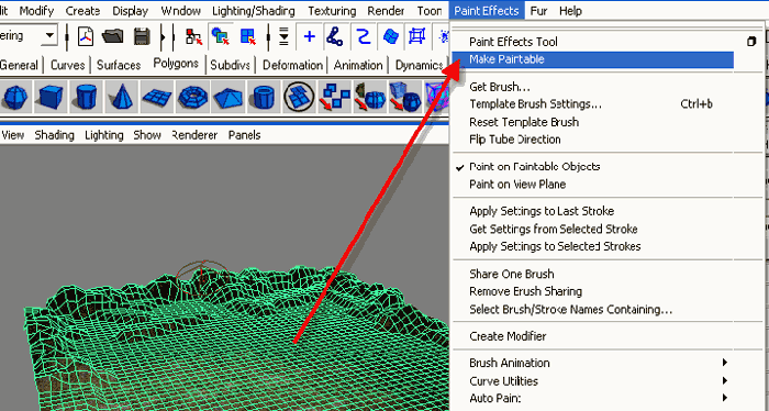 步骤4:选择平面,然后进入Paint Effects(绘制效果)菜单中选择Make Paintable(成为绘图板),选择表面是绘图板,可以使用任何绘制效果。