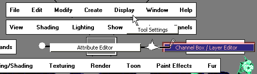 步骤8:进入Attributes Editor(属性编辑器),按下键盘的空格键,通道框菜单将出现在空白处。右键点击选择Attributes(属性),然后再点击Channel Box/Layer Editor(通道框/层编辑器)。