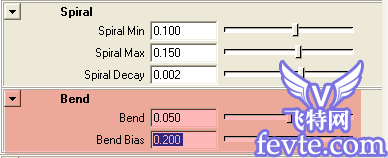 步骤12:西那在打开Flowers(花)、Turbulance(紊乱)、Spiral(自旋)和Bend(弯曲)标签并进行如下设置。