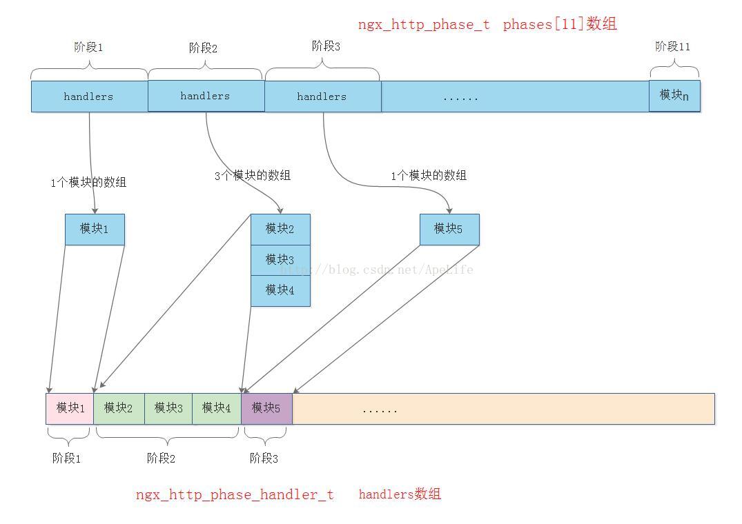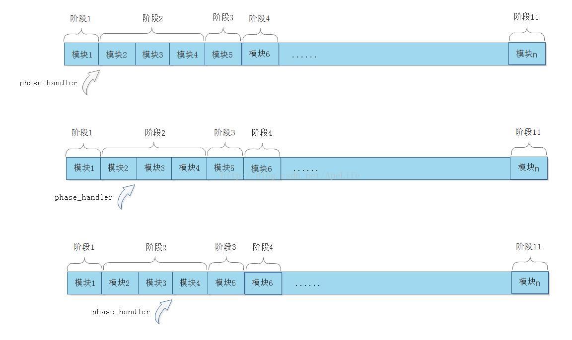 假设阶段2有三个http模块介入了http请求, 阶段3有一个模块介入了http请求、阶段4也有一个模块介入了请求。当开始处理阶段2时,将调用阶段2中的所有http模块进行处理,此时phase_handler指向阶段2的开始位置。之后每处理完阶段2中的一个模块时,phase_handler指向阶段2的下一个模块,直到阶段2处理完成。