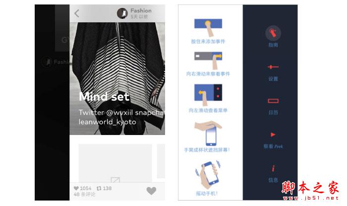以iOS用户为例,常规返回按键多设定在屏幕左上角,对于大屏用户来说是不易触及的点击盲区。而Storehouse配合手势操作辅助,右滑退出界面,带来了极大便利性,滑动代替点击退出的用户习惯也逐步养成。PEEK是一个以手势为主导的应用,通过手势变化进行相应操作,大胆的舍弃了功能按键。