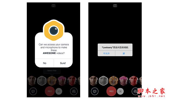 Looksery产品在调用iOS系统相机请求之前,通过情感化图标和询问式语言,向用户传达了调起相机的作用,让用户了解调用目的,使授权转化率得到很大的提高。