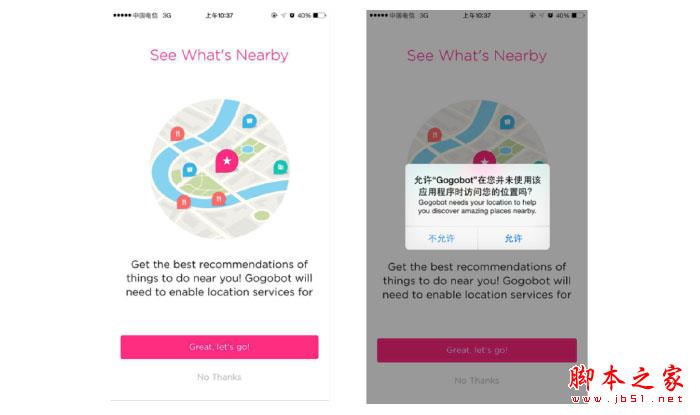 Gogobot产品在获取用户地理位置之前,描述对应使用场景及其必要性,满足用户对开放此权限的心理预期,提升授权转化率。