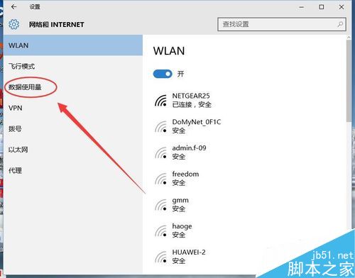 4、在网络和Internet选项的菜单栏有一项“数据使用量”在这里就可以查看数据使用情况了,单击打开