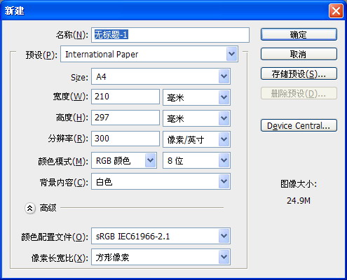 1新建文件 首先第一步就是打开Photoshop,新建文件,一般我们是新建300分辨率,国际标准纸张A4大小的页面文件,【颜色模式】一般是RGB或者CMYK。