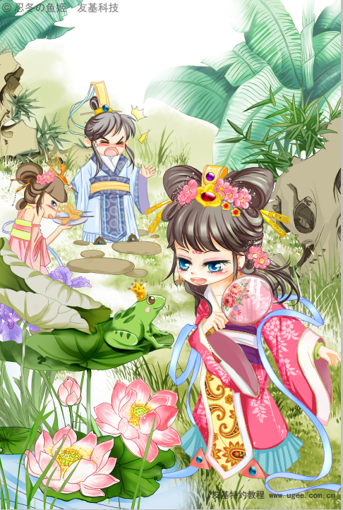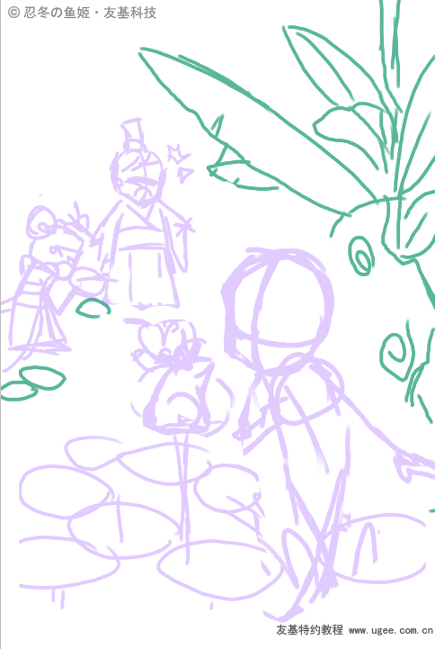 2草稿绘制 起草稿要现在脑海中构思整个画面想要表达什么,这幅画想要绘制成明媚的阳光下,小公主在荷花池旁边想要亲吻青蛙,而冷落了在一旁偷窥的王子殿下,充满调皮情趣。 构思好画面后在新建图层里绘制,我们绘制出的这张粗略的草稿,画出大概的构图,公主的动态姿势,以及周边的花草树木,抓狂的王子殿下和他的小侍女。这是第一步的草图,接下来我们还会在后面的绘制过程中做调整。