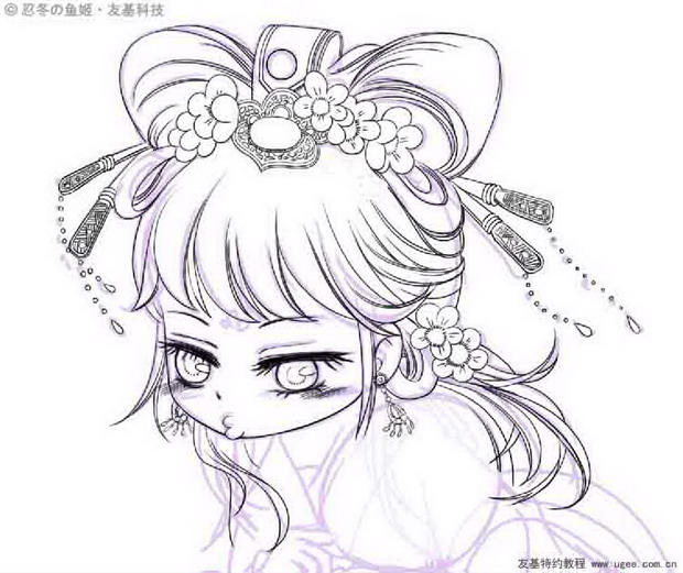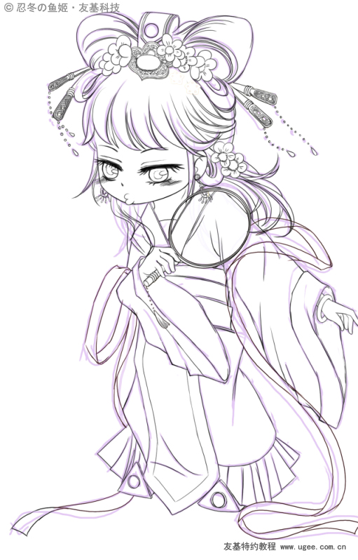 3草稿细化 在上一步的基础上,另建新层,开始继续勾画细节,根据人物动态的画出服装头饰。周边花草也要添加上,勾画出较为详细的草稿。