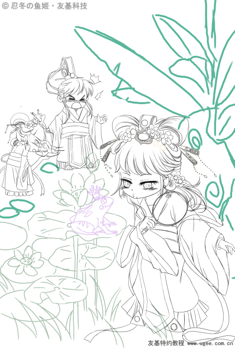 完成了人物线稿的绘制,接下来我们画出周围环境中的荷花荷叶以及周边的水草,要注意细节的刻画,荷花以及花蕊要尽量用圆润的线条去刻画。背景的山要选择用硬朗的线条去刻画,以体现出石头的质感。芭蕉的叶子也要用尽量用柔美的线条去表现,和山的质感形成鲜明对比,增加画面美感。这些我们也要记得分图层来画!比如 山一个图层,竹叶一个图层,芭蕉叶一个图层,养成良好的习惯,不仅方便修改,还能节省不少时间呢。