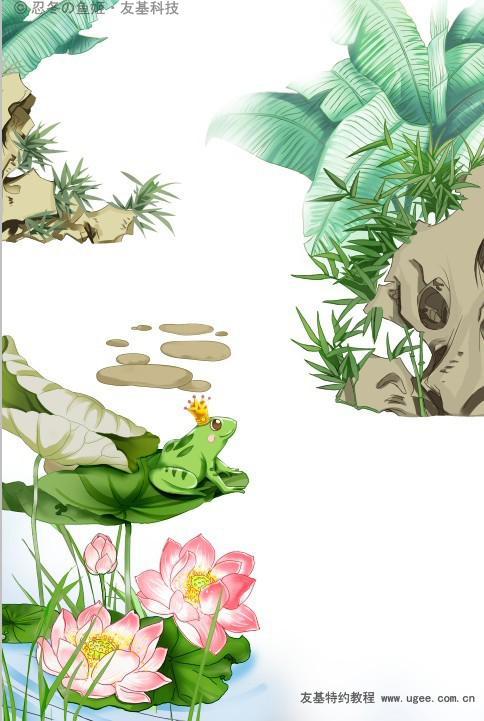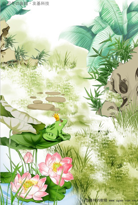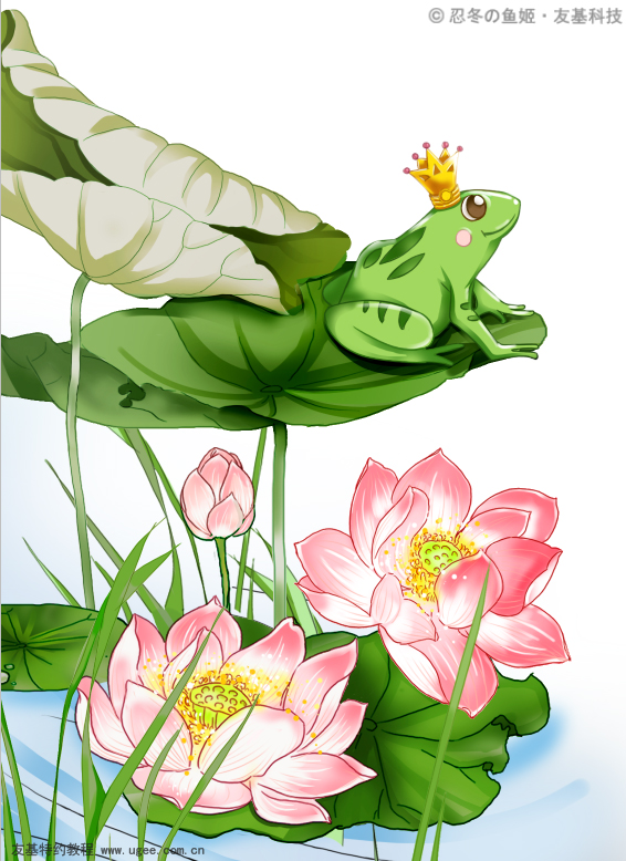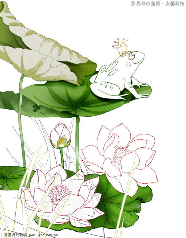 9前景绘制 记得在先搞下面新建图层呦,比如,荷叶一层,荷花一层,水草一层,青蛙一层。 在绘制荷叶时要注意荷叶正反两面颜色的不同,绘制阴影是注意按照叶脉的走向来绘制。