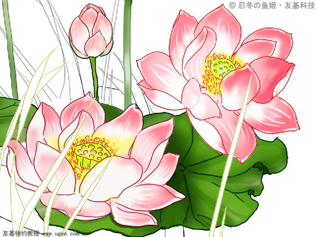 绘制荷花时注意荷花的叶脉走向,同样荷花的正反花瓣颜色深浅是有变化的,花蕊可以选择用虚笔来表现其柔嫩的质感。