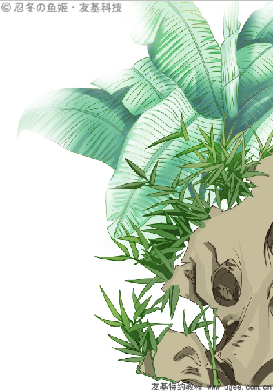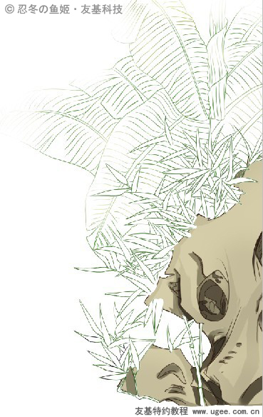 绘制芭蕉叶时,在线稿下面新建图层,填充叶子的固有色,然后再按照叶脉的走向画出叶子的阴影,分出层次。用“虚笔”将芭蕉叶打虚,很朦胧哦!这样也遵循了近实远虚的原则。