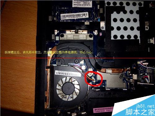 二,取出风扇。拆掉螺丝后还需要拔除风扇的电源线,风扇下面有胶布,半提起风扇,将胶布摘除,然后拔出电源线,没有固定顺序,哪样方便哪样来