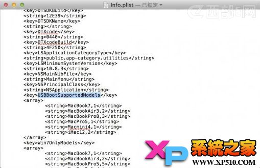 然后编辑桌面上的 Info.plist,可以用任意纯文本编辑器打开进行编辑,找到PreUSBBootSupportedModels,将其修改成 USBBootSupportedModels,其实也就是将前面的 Pre 去掉,然后保存之。