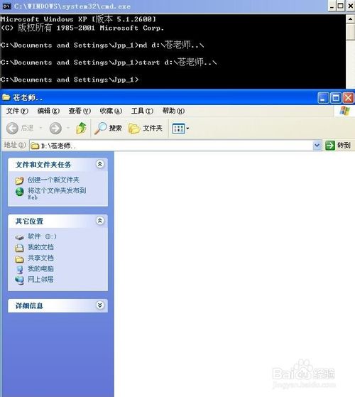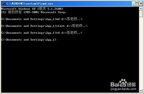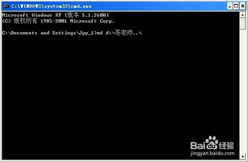3、在出现的“命令提示符”窗口中,输入“md d:\苍老师..\”,然后敲击回车键,电脑就会自动在D盘建立一个名称为“苍老师.”的文件夹。(说明:输入内容解释一下,md大小写均可,然后中间空一格输入d表示D盘,当然你也可以输入C,E,F等,然后输入冒号,再斜杠,然后输入文件夹名称,再连续输入两个小数点,再输入斜杠。至于文件夹名称,可以随你输入,但其余的字母或者字符,要求在英文输入法下进行输入,切不可以中文字符输入)