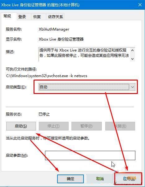 2、以【Xbox Live 身份验证管理器】为例,双击打开该服务,将其“启动类型”修改为【自动】,然后依次点击【应用】——【启动】——【确定】即可。