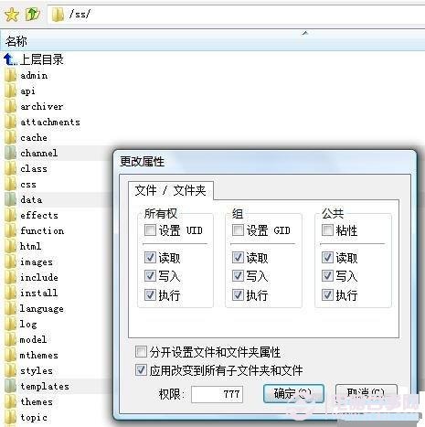 步骤二:将【权限】项中的数字改为【777】,确定即可(前提是您的帐号有修改文件属性的权限)
