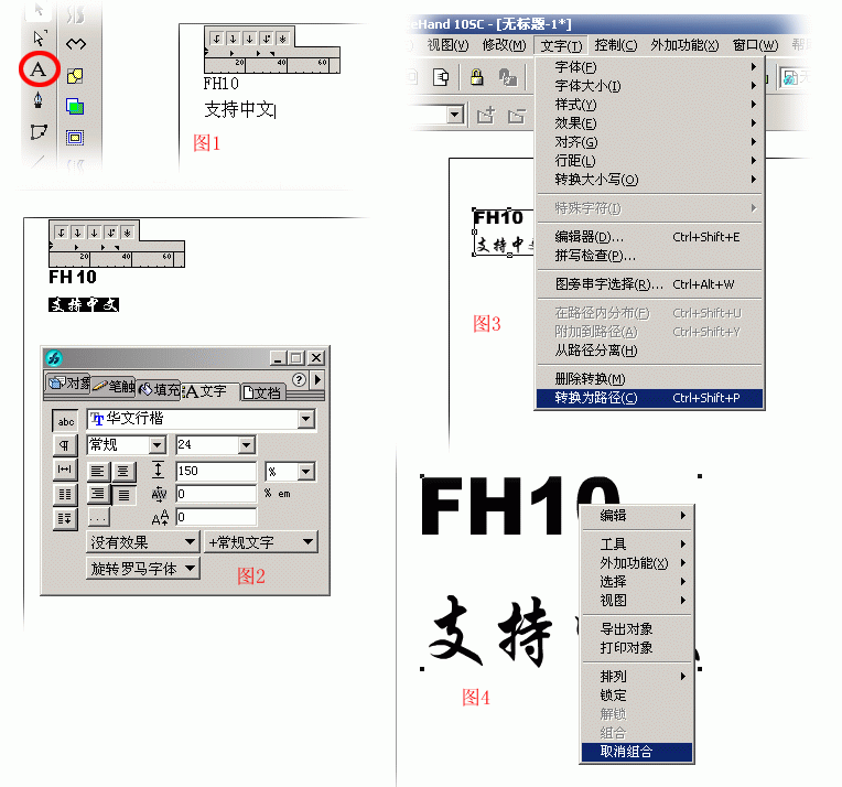 图5)这时“FH10”和“支持中文”相互独立,把后者调得稍大一些,再使前者有一个角度,方法很简单,在对象上双击会在其四边出现出现八个黑粗的控制点,鼠标放在点上可进行拖拽式缩放,鼠标放在点外可进行旋转。注意,八个控制点的中心有一朵小黑花,那是缩放和旋转的基点,可以自由安排其位置。这一步很简单,再用图示显得太罗嗦,大家自己试试吧。这功能非常常用,以后的例子里也要用到的。