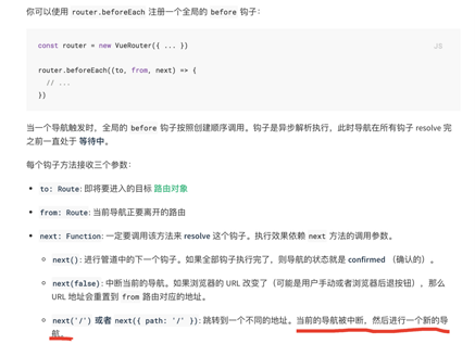 - next() 表示路由成功,直接进入to路由,不会再次调用router.beforeEach()