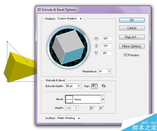 确保三角形仍被选中,执行效果>3D>凸出和斜角,按下图所示输入数值。