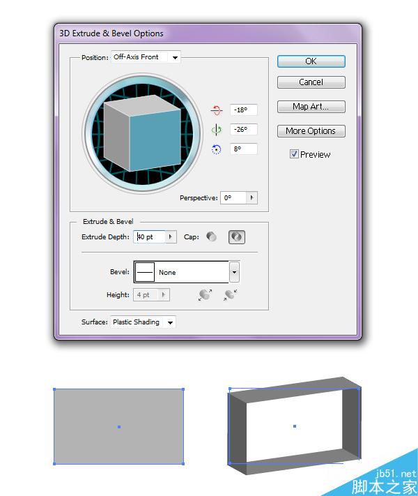 在AI里创建灰色的矩形,然后执行效果>3D>凸出和斜角,参数如下图。