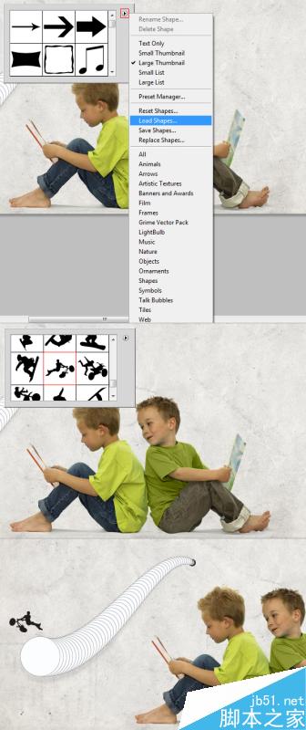 这个螺旋形状很有爱的一点就是你可以在它身上尝试无限的创意。我们来创建一个自行车手的剪影,并使他看上去是从一个斜坡上滑下来后腾空到最高点。你可以下载这个很酷的剪影包(链接点击英文),这个图包里有两个文件夹,我们用到的是 ”CSH”(把它放到PS安装路径下的Custom Shape文件夹里),把它添加进PS,选择自定形状工具(U)并在画板上右击,你可以在弹出的面版的右上方找到一个小箭头,点击它并选择"载入形状",载入extreme actions”,你现在应该可以在形状列表里看到它们了。选择一个你喜欢的,把它摆在螺旋的末端,设置颜色为#201c1d。
