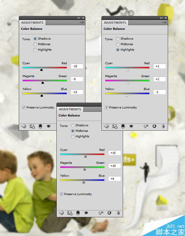 你可能注意到了现在图像的色调有些单调乏味,那么给它加点儿料吧,我们来添加一些色调和曝光度的调整层。依次执行图层>新建调整图层>色彩平衡,亮度/对比度,渐变映射。具体参数请参考下图。注意:将渐变映射的混合模式改为叠加,不透明度20%。