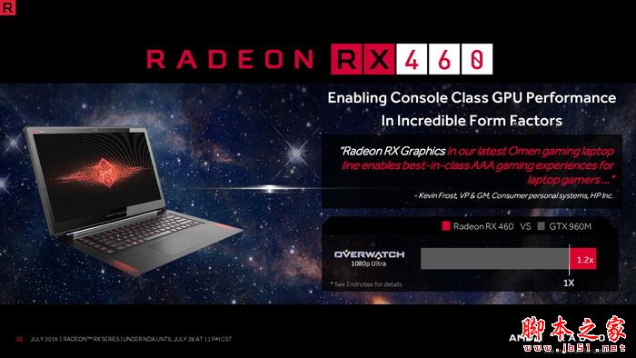 对于RX 460来说,它除了在桌面显卡市场上担当低端主力之外,另一个重点则是笔记本市场,为此AMD还开发了新型的封装,厚度从1.9mm降至1.5mm。至于性能,AMD PPT中有与GTX 960M的对比,表示性能比后者高了20%,如果真是如此,这还不错。